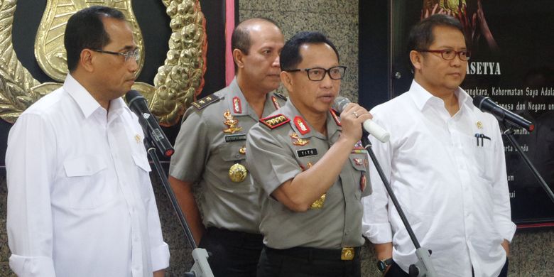KOMPAS.com/AMBARANIE NADIA Menteri Perhubungan Budk Karya Sumadi, Kapolri Jenderal Pol Tito Karnavian, dan Menkominfo Rudiantara dalam jumpa pers di kompleks Mabes Polri, Jakarta, Selasa (21/3/2017).