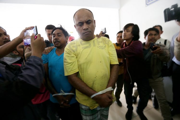 KRISTIANTO PURNOMO Dua pelaku penganiayaan dan pengeroyokan terhadap pakar IT ITB Hermansyah, Lauren Paliyama (kaus biru) dan Edwin Hitipeuw (kaus kuning) tiba di Direktorat Reserse Kriminal Umum Polda Metro Jaya, Jakarta, Rabu (12/11/2017). Tim gabungan Polresta Depok, Polres Jakarta Timur, dan Polda Metro Jaya menangkap dua dari empat pelaku penganiayaan Hermansyah, di Jalan Raya Sawan gan. KOMPAS IMAGES/KRISTIANTO PURNOMO