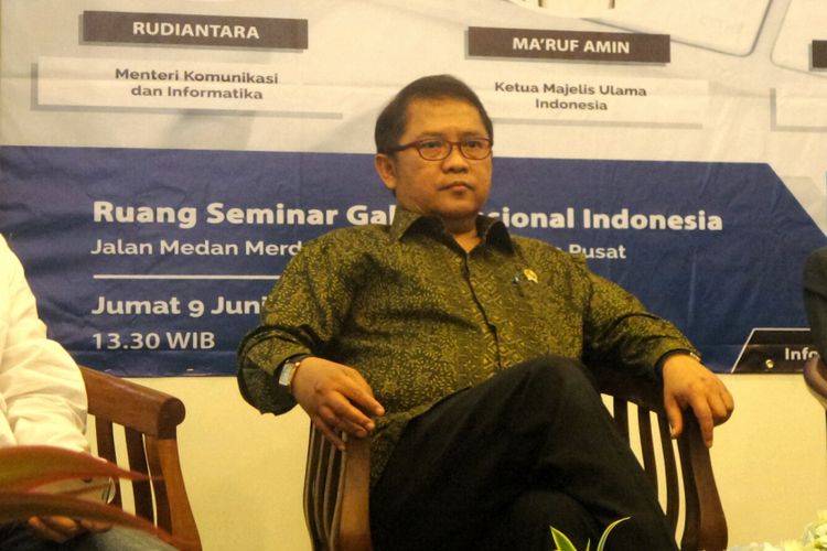 KOMPAS.com/Kristian Erdianto Menteri Komunikasi dan Informatika (Menkominfo) Rudiantara dalam sebuah diskusi bertajuk Bedah Fatwa MUI #MuamalahMedsosiah di Galeri Nasional, Jakarta Pusat, Jumat (9/6/2017).